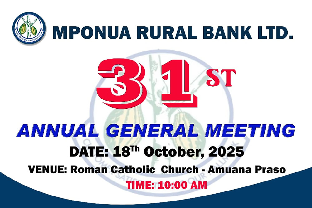 Mponua Rural Bank Ltd. is proud to announce its 31st Annual General Meeting (AGM), scheduled for Saturday, the 18th of October, 2025, at 10:00 AM.